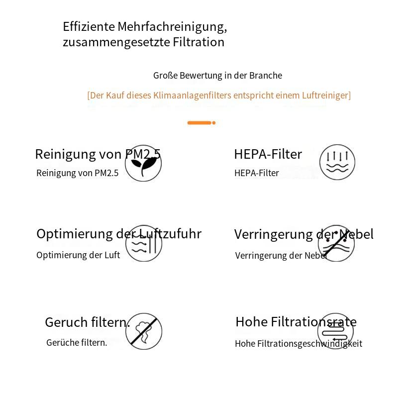 N95‑Filtereinsatz mit Aktivkohle für MG Fahrzeuge: filtert zuverlässig schädliche Partikel und Gerüche, verbessert Luftqualität und Fahrkomfort. Die Funktion und Nutzungsdauer des Auto-Klimafilters: **Funktion:** - **Filterung der Innenraumluft:** Der Klimafilter filtert hauptsächlich Staub, Pollen und Partikel aus der Luft, die in den Fahrzeuginnenraum gelangt, und verbessert so die Luftqualität im Fahrzeug. - **Entfernung von Schadstoffen und Gerüchen:** Hochwertige Klimafilter enthalten oft Aktivkohle, die unangenehme Gerüche sowie schädliche Gase wie Formaldehyd und Benzol aus der Luft aufnehmen kann, um die Gesundheit der Fahrzeuginsassen zu schützen. - **Vermeidung von Verstopfungen im Klimasystem:** Der Filter reduziert das Eindringen von Partikeln in das Klimasystem und verhindert dadurch, dass Staubansammlungen zu Störungen oder Schäden führen. **Nutzungsdauer:** Die empfohlene Austauschfrequenz eines Klimafilters liegt normalerweise bei **10.000 bis 20.000 Kilometern** oder **6 bis 12 Monaten**. Wenn das Fahrzeug häufig in stark verschmutzten Umgebungen wie bei Smog oder in staubigen Gebieten eingesetzt wird, sollte der Filter häufiger geprüft und bei Bedarf ersetzt werden.