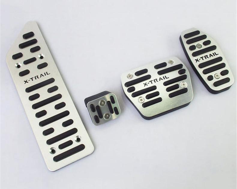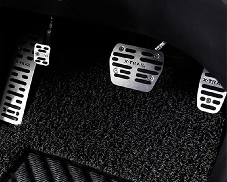 Sportliches Pedalkappen-Set aus Metall mit Anti-Rutsch-Einlagen für Gaspedal, Bremse, Kupplung und Fußstütze. Verbessert Grip, Optik und Fahrkomfort im X-Trail T32.