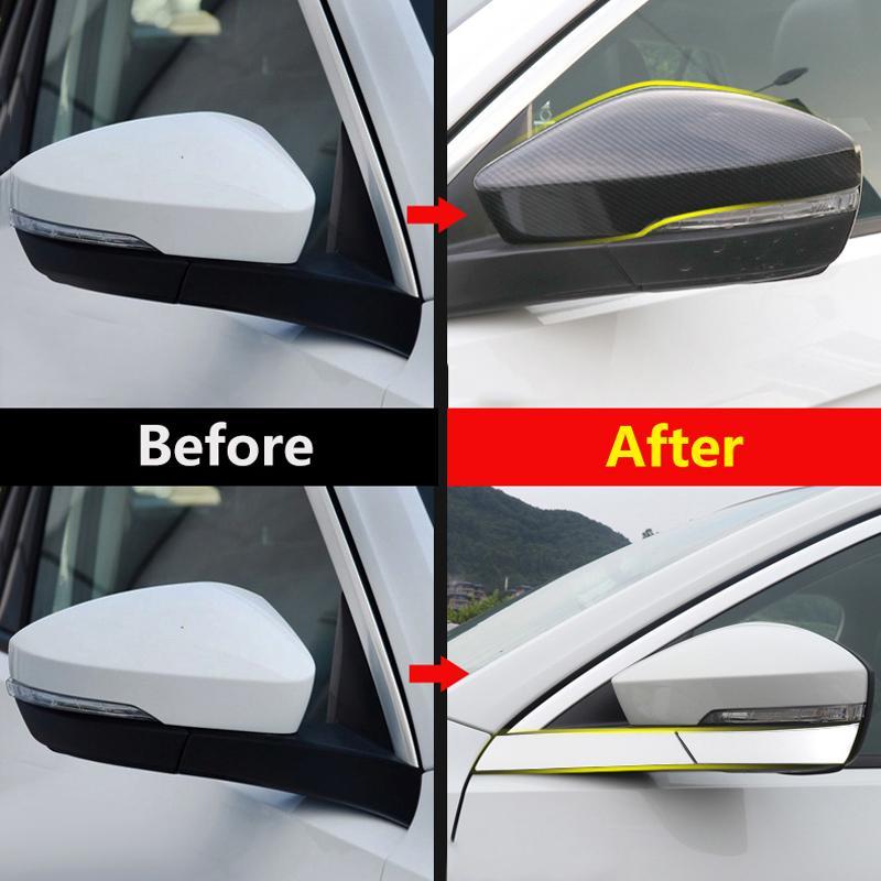 Diese Blenden für die Außenspiegel kombinieren Carbon-Optik mit einem Chromstreifen, sind UV-beständig und schützen den Lack des Spiegels vor kleinen Steinschlägen.